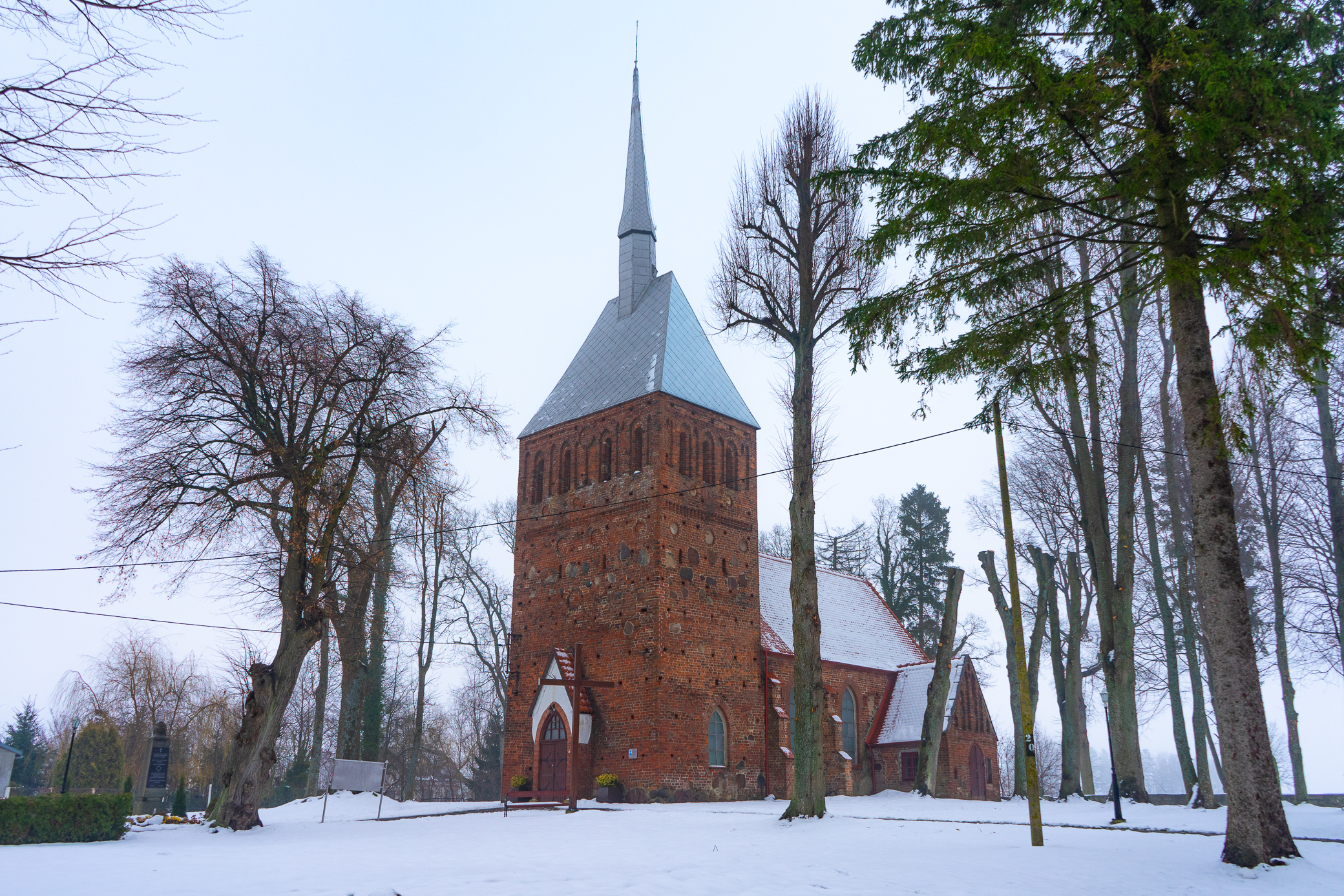Das große Gotteshaus stammt aus dem 15. Jh. und entstand aus rotem Ziegelstein sowie Feldsteinen. Dank seines Standortes auf einem nicht großen Hügel thront es zweifelsohne über dem Dorf. Das Bauwerk besitzt einen rechteckigen Grundriss, der an der Vorderseite stehende Turm wiederum einen quadratischen Grundriss. Ein spitzes Dach schließt ihn ab. Ein interessantes, architektonisches Detail, das pommernweit seinesgleichen sucht, ist die runde Sonnenskulptur mit runden Backen und Haaren, welche Sonnenstrahlen imitieren. Die Skulptur befindet sich an der westlichen Kirchturmwand. Einst hingen in dem Turm Glocken, die jedoch während des Krieges vom Militär zweckentfremdet wurden. Im Kircheninnenraum können das Orgelprospekt aus dem 19. Jh. sowie ein mehrere Meter hohes Flachrelief mit dem einen Drachen tötenden hl. Georg bewundert werden.